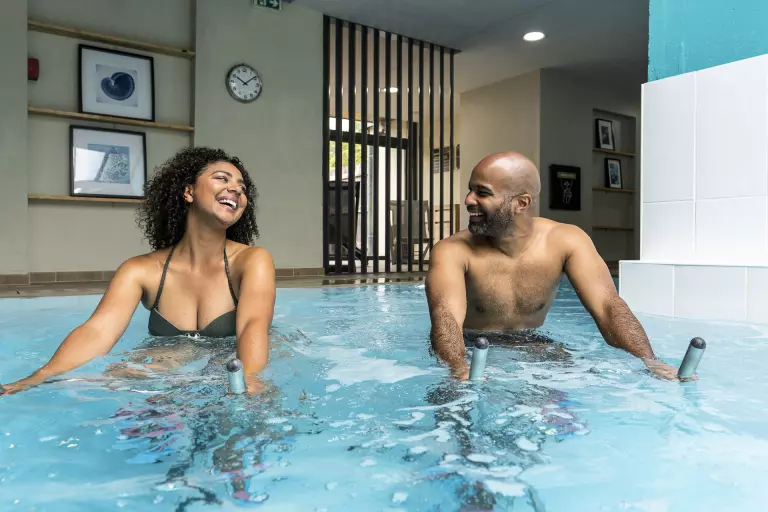 En cualquier momento del día, dése un momento de relajación en la piscina cubierta, deslizarse sobre las pistas de diapositivas o divertirse bajo los chorros de agua.