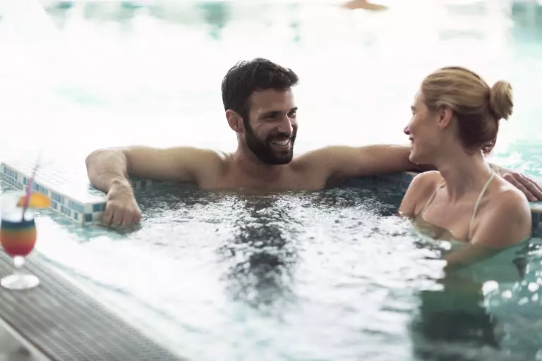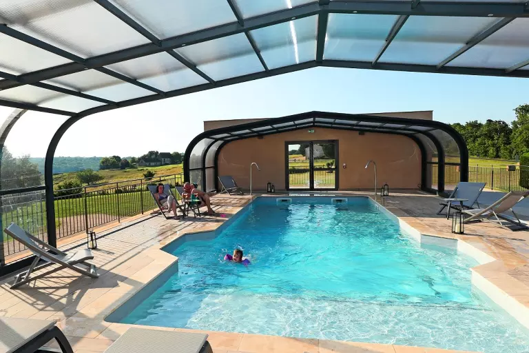 Para su relajación y disfrutar de los placeres del agua durante toda la temporada, la zona interior ofrece una bonita piscina (12 m x 4 m) climatizada a 28°, decorado con bancos de balneoterapia, cañones de agua y una zona de relajación con sauna.