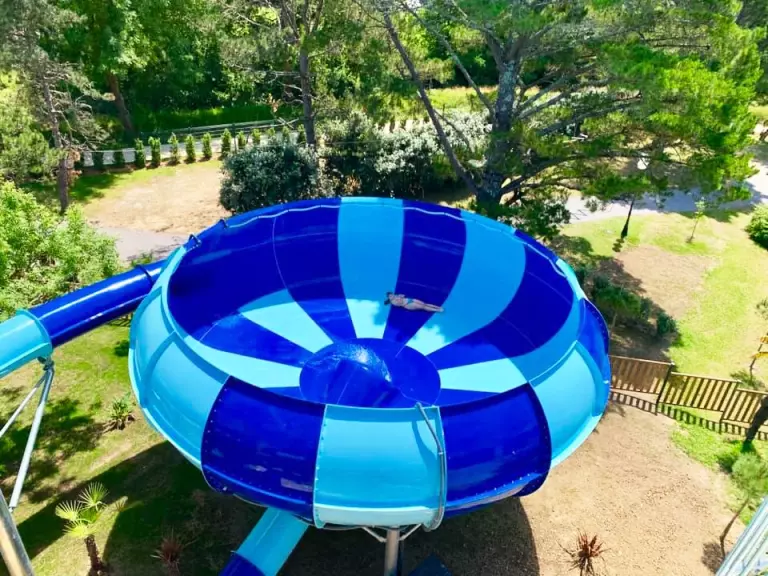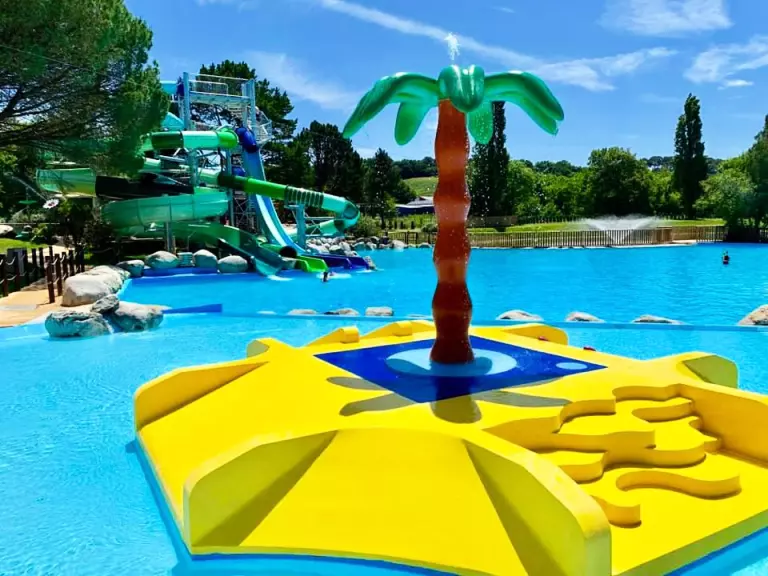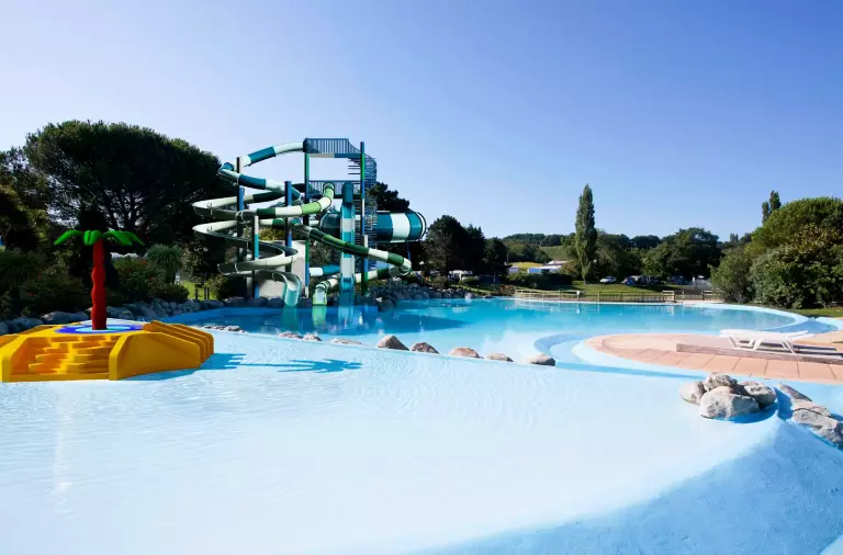 A su disposición, una gran piscina con piscina juguetona de 600 m2 con chorros, cubos y cañones de agua. 4 toboganes de agua que deleitarán más de uno: Kamikaze, Giant, Hydro-tube y el increíble Space Bowl... ¡Se va a desentrañar!
